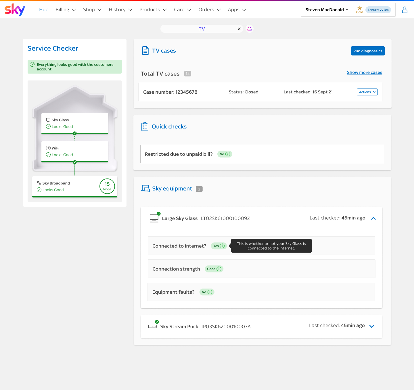 Sky prides themselves on quality customer care and with the launch of their new Sky Glass technology it was important that agents were able to help customers calling in with issues. Issues not only related to Sky Glass but to legacy products as well. By the end of three years we launched a Care Platform that met the goals mentioned above. It comprised of three main parts: Care Hub, Diagnostics and Test Results.
